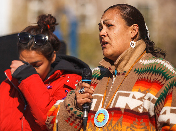 At the Mic: Stephanie English, right, is overcome with emotion as she speaks at the Sisters in Spirit March. (Photo by Amanda Siebert/The Press)
