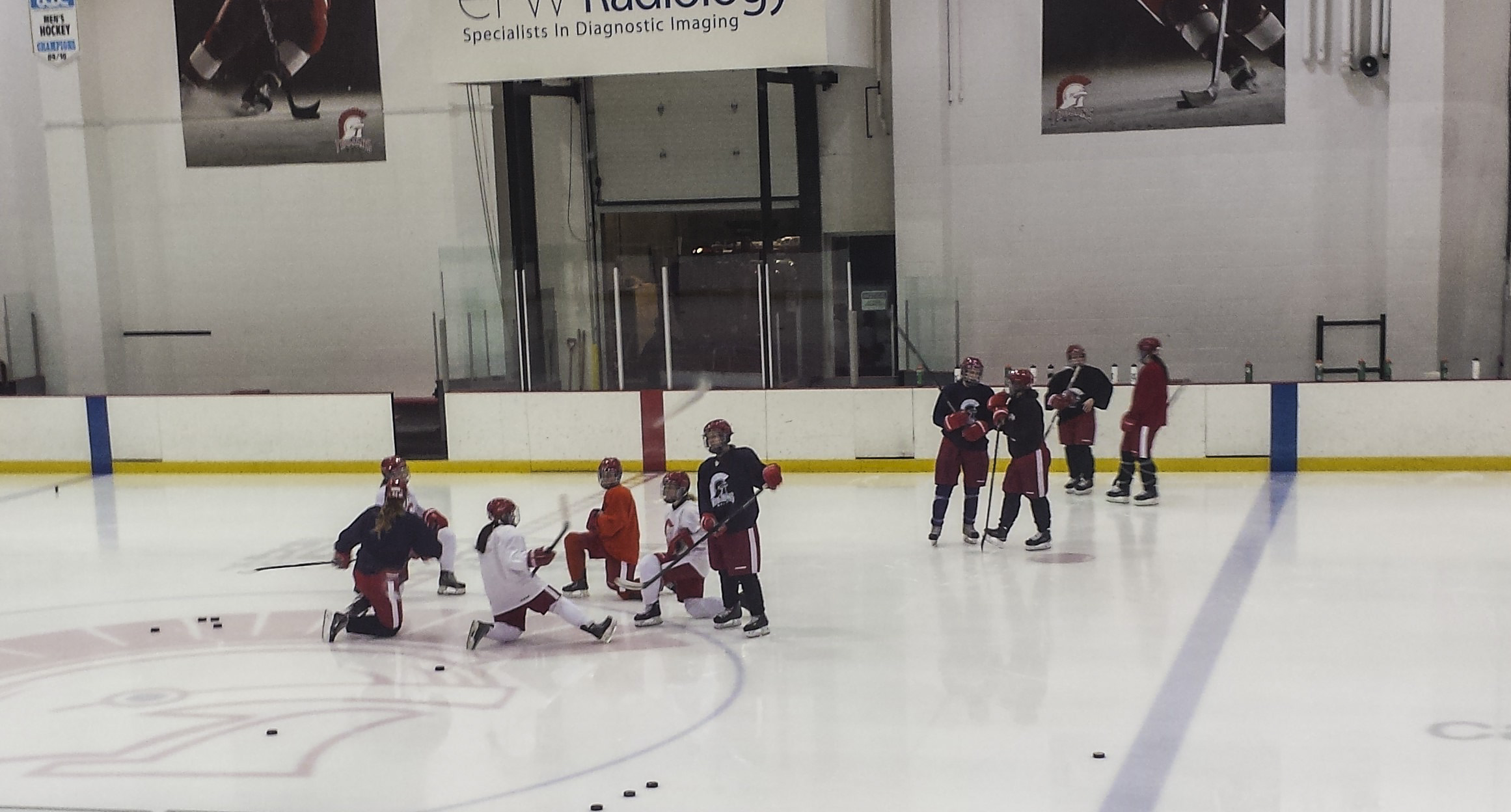 Start your stretching: Trojans women’s hockey team warm up with stretching and are also communicating before they start their practice on Nov. 6, 2015 at 6 p.m.
