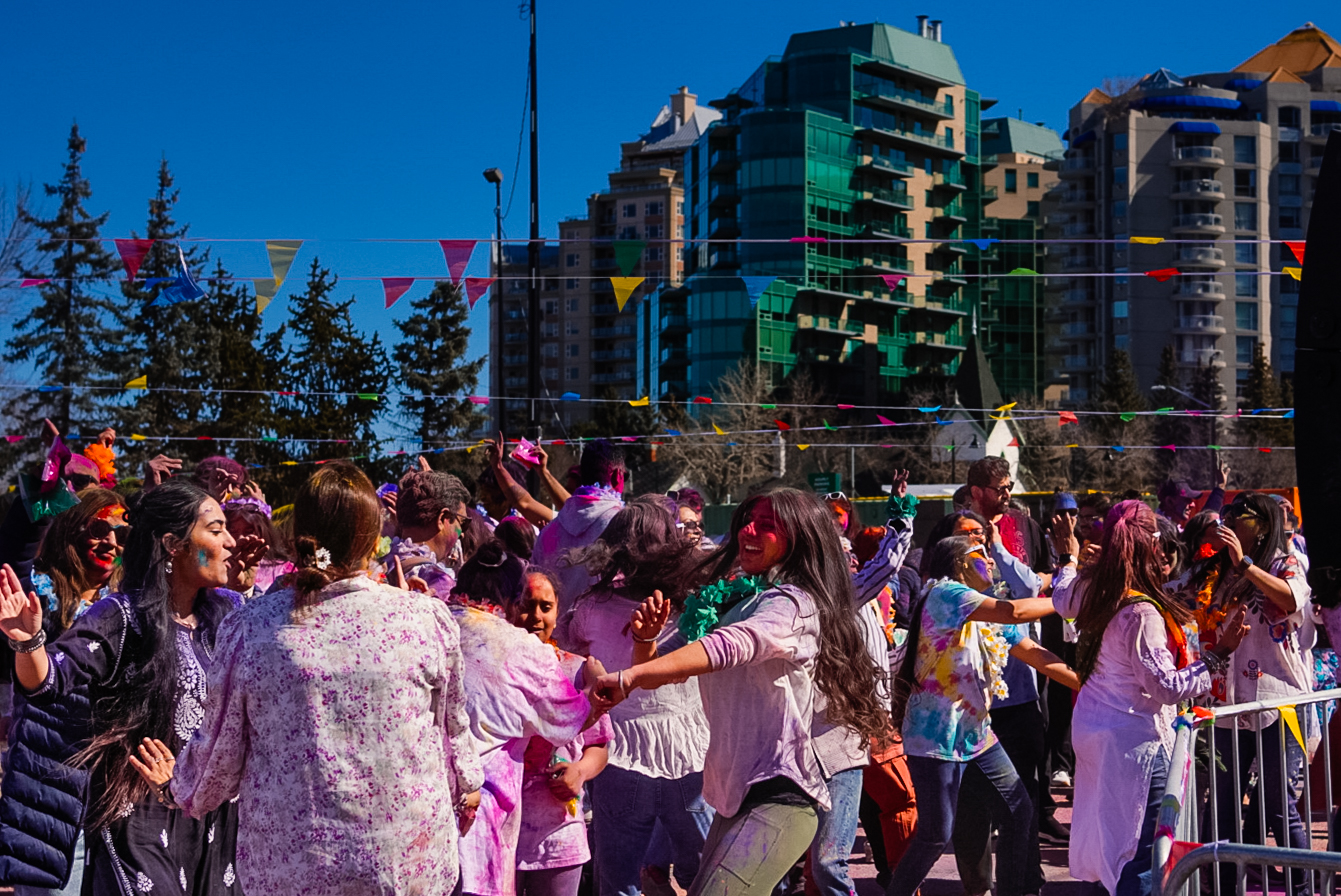 Strangers becoming friends on the dance floor at the Holi festival in downtown Calgary. The dance floor brings everyone together on Saturday April 4, 2026. (Photo by photo by Alicia/ SAIT)